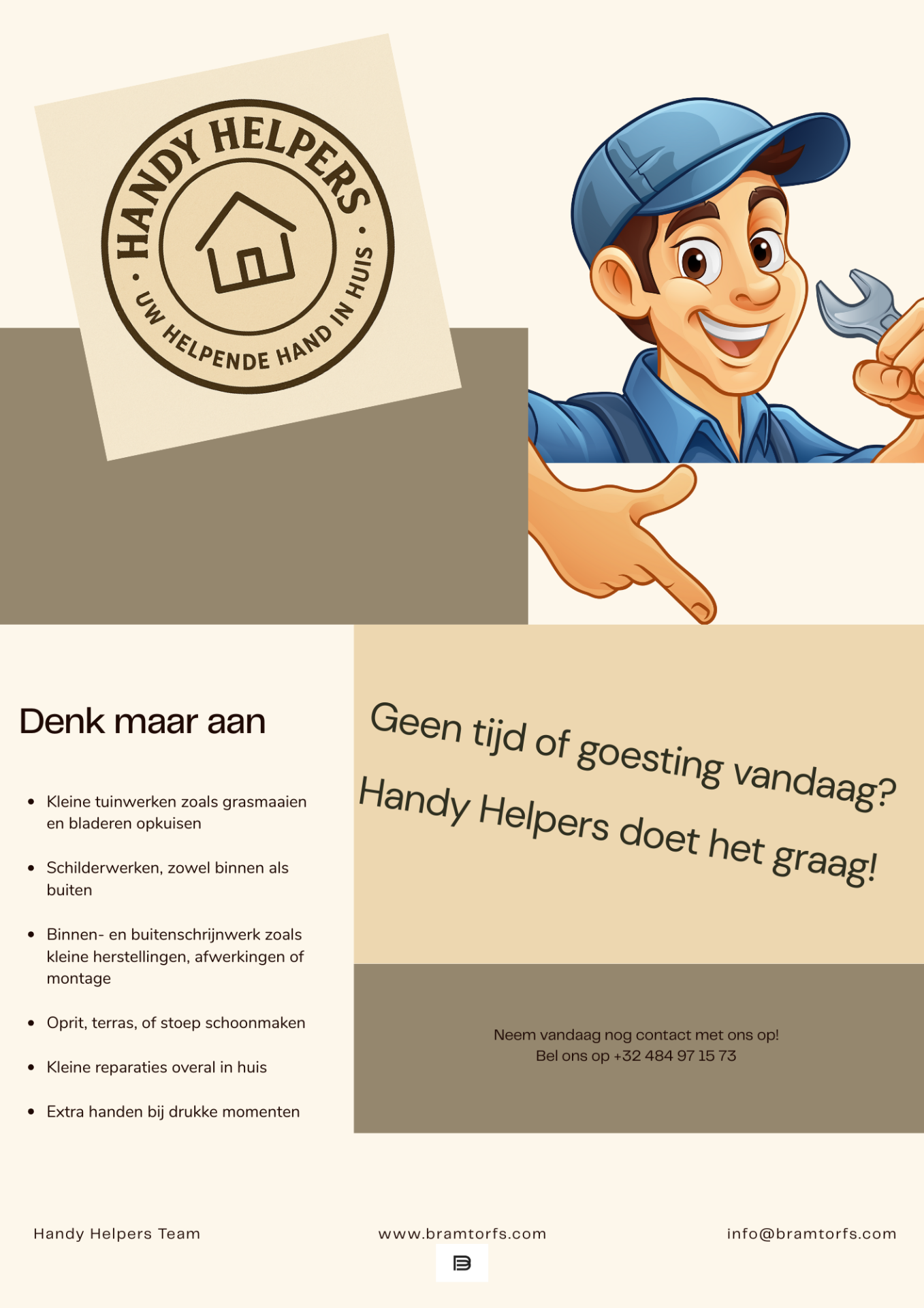 Handy Helpers staat klaar voor wie hulp nodig heeft bij kleine klussen, opruimwerken en het opfrissen van woningen. Wij helpen waar anderen stoppen: snel, correct en met respect voor woning en omgeving. Lokaal verankerd, persoonlijk betrokken en altijd bereikbaar voor werk dat écht gedaan moet worden.